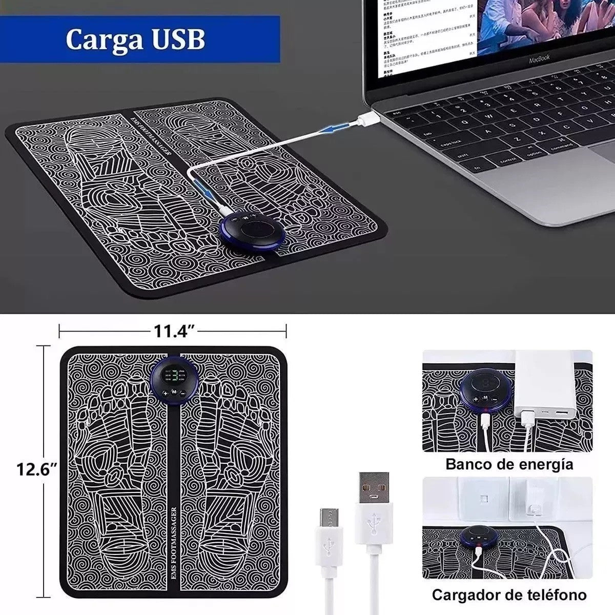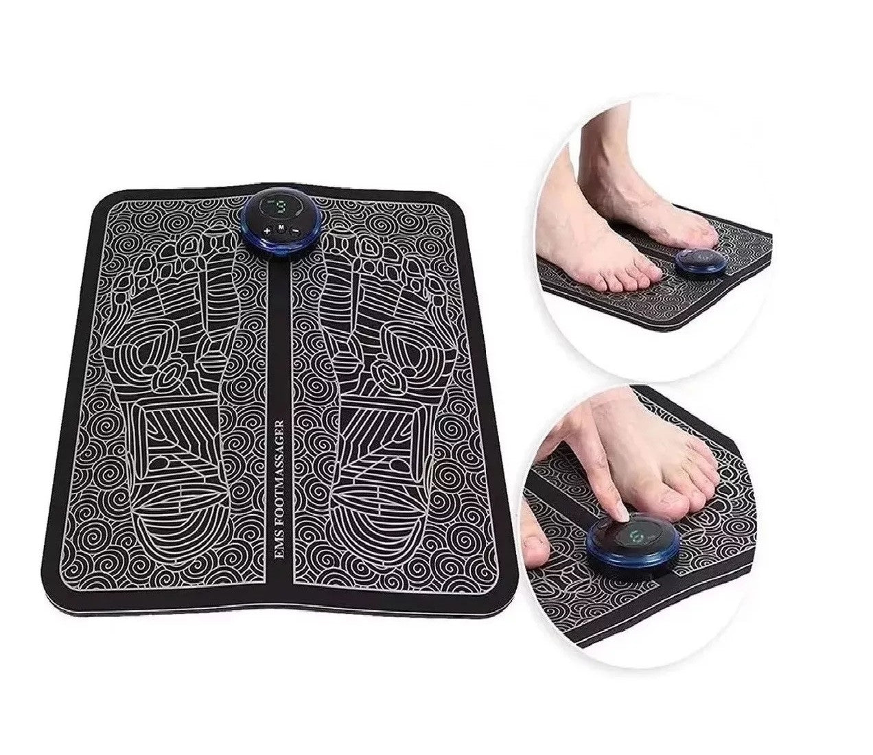 • 1.MASAJEADOR DE PIES EMS: Una almohadilla para los pies suave y cómoda, liviana, plegable, fácil de llevar a cualquier lugar, se puede secar con una toalla húmeda después de su uso. Utiliza la tecnología EMS para el masaje de los músculos del pie, el tobillo, el tendón de Aquiles y la pantorrilla, para promover la circulación sanguínea y relajar los pies. (NOTA: no debe usar si tiene un marcapasos o presión arterial alta; quítese los calcetines antes de usar y coloque los 2 pies en la almohadilla)@@3.CAPTURA INTELIGENTE DE PUNTOS DE ACUPUNTURA: El masaje EMS inteligente estimula directamente los puntos de acupuntura, lo que puede aliviar el dolor y reducir la fatiga, apto para todo tipo de pies y pies de diferentes tamaños. @@4.PERSONAS QUE SE PUEDEN APLICAR: El masajeador eléctrico de circulación de pies EMS está diseñado especialmente para entusiastas de los deportes, ancianos y trabajadores de oficina sedentarios/de pie. Proporciona una gran relajación y alivia las piernas doloridas.   NOTA: El masajeador de pies suave y cómodo se puede secar con una toalla húmeda después de su uso.GARANTÍA  ¿Tu producto tiene alguna novedad que debamos reportar?* Una vez recibas tu producto, cuentas con máximo 5 días para reportar a Soporte: piezas faltantes, rotas o cualquier novedad que presente el producto.*¿No era lo que esperabas?* Aplica Ley retracto Durante 5 días, contados a partir de la recepción del producto, para la devolución, ten en cuenta que debe estar en las condiciones que se recibió, con su empaque original, con las etiquetas, sellos de seguridad, y contar con todas sus partes y/o accesorios. Sin rayones ni manchas. Se recibirá únicamente en óptimas condiciones. Se anulará automáticamente el derecho a retracto si el producto fue usado.*¿Tu producto está presentando fallas?* Cuentas con 30 días de garantía por funcionamiento y/o daños del producto que no estén relacionados a su mal uso. Para hacer efectiva la devolución, el producto debe entregarse debidamente protegido cuidando el estado del empaque original, incluya todos los documentos y/o manuales (si aplica) y las partes completas.